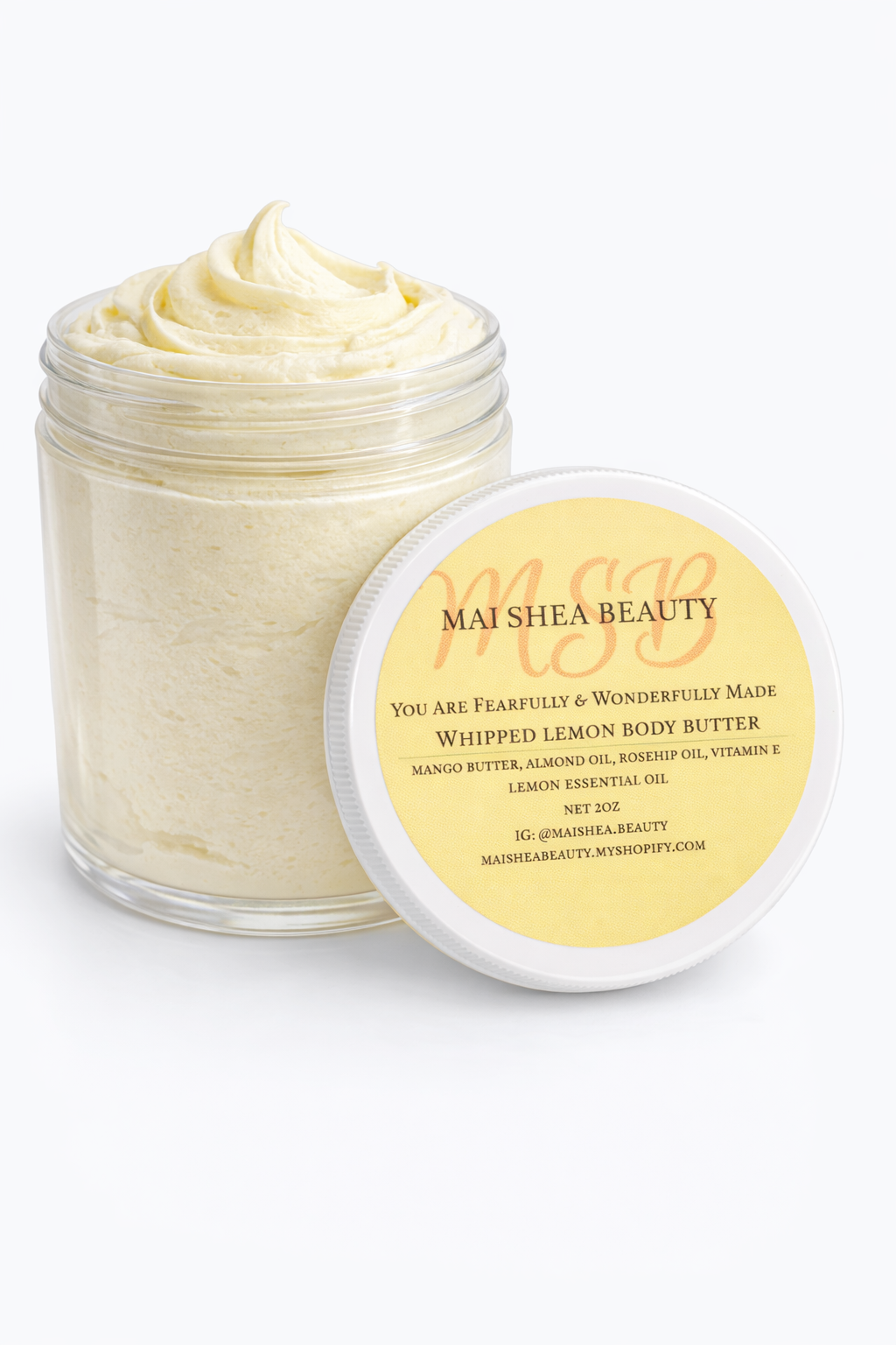 Brighten your glow from head to toe with MSB's Whipped Lemon Body Butter, a light, hand crafted blend to deeply moisturize both skin and hair. This silky whipped formula melts instantly, delivering long‑lasting hydration and a smooth, radiant finish.